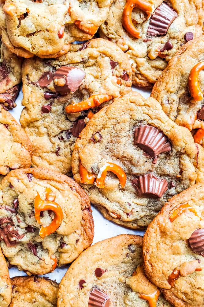 #Butter Cup | Looking for the perfect salty and sweet combo?! Check out these Peanut Butter Cup Cookies loaded with mini peanut butter cups and pretzels for a delicious flavor combination.