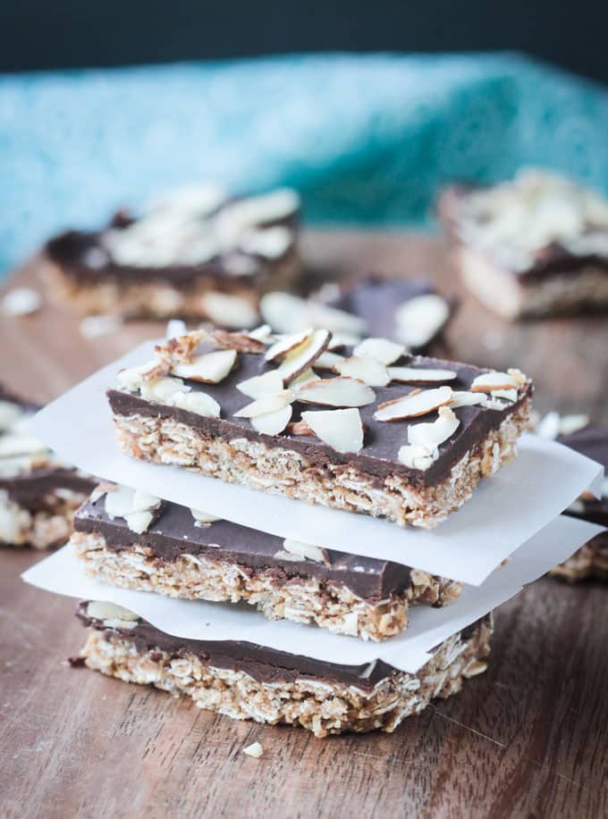 #Gluten Free | Healthy whole grain oats & almonds come together in a chewy snack bar! Coat these Triple Almond Oat Bars with chocolate for an even more indulgent treat!